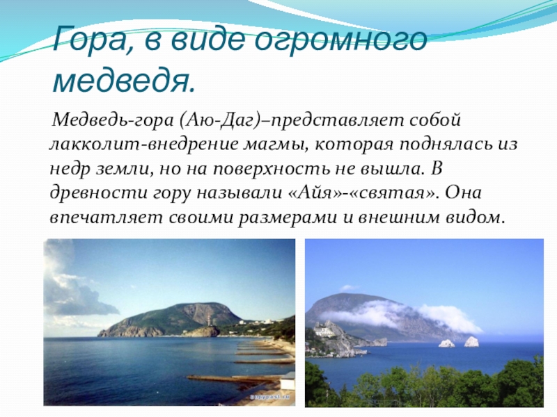 Медведь-гора (Аю-Даг)–представляет собой лакколит-внедрение магмы,