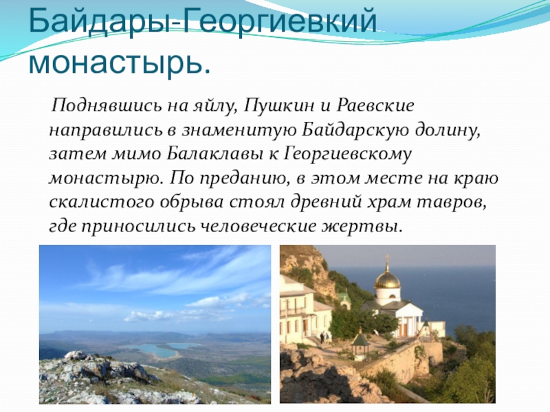 знаменитую Байдарскую долину, затем мимо Балаклавы к Георгиевскому монастырю. По преданию, в этом месте на краю скалистого обрыва стоял древний храм тавров, где приносились человеческие жертвы.