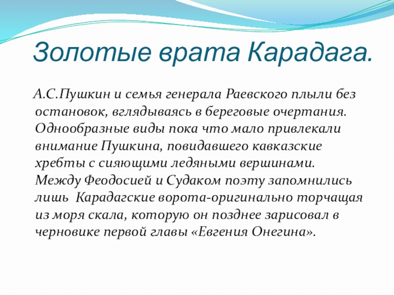 Между Феодосией и Судаком поэту запомнились лишь Карадагские ворота-оригинально торчащая из моря скала, которую он позднее зарисовал в черновике первой главы «Евгения Онегина».