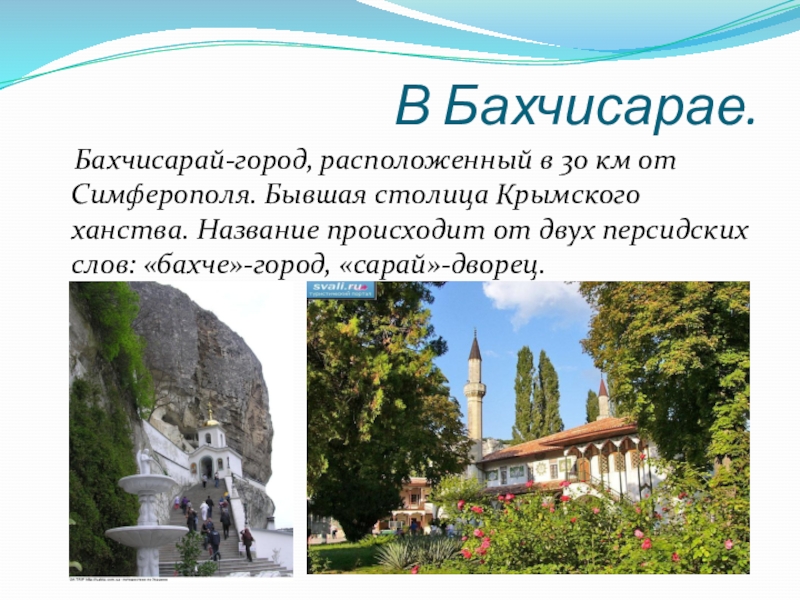 Бахчисарай-город, расположенный в 30 км от Симферополя. Бывшая