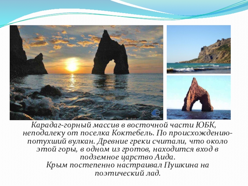 Слайд 8Карадаг-горный массив в восточной части ЮБК, неподалеку от поселка Коктебель.