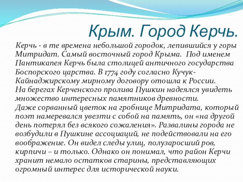 Даже сорванный цветок на гробнице Митридата, который поэт намеревался увезти с собой на память, он «на другой день потерял без всякого сожаления». Развалины города не возбудили в Пушкине ассоциаций, не подействовали на его воображение. Он видел следы улиц, полузаросший ров, кирпичи – и только. Однако он понимал, что район Керчи хранит немало остатков старины, представляющих огромный интерес для исторической науки.
