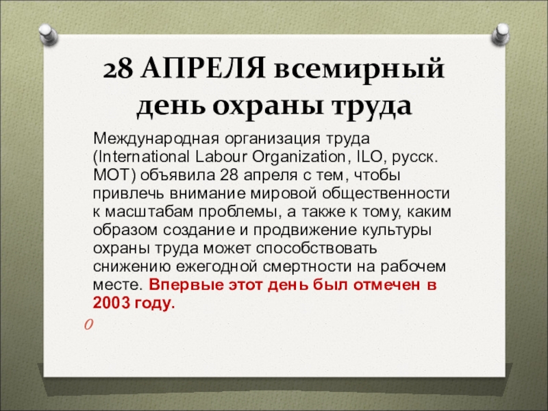 Organization, ILO, русск. МОТ) объявила 28 апреля с тем, чтобы привлечь внимание мировой общественности к масштабам проблемы, а также к тому, каким образом создание и продвижение культуры охраны труда может способствовать снижению ежегодной смертности на рабочем месте. Впервые этот день был отмечен в 2003 году.