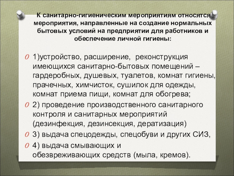 Слайд 14 К санитарно-гигиеническим мероприятиям относятся мероприятия, направленные на создание нормальных бытовых условий