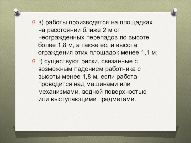 г) существуют риски, связанные с возможным падением работника с высоты менее 1,8 м, если работа проводится над машинами или механизмами, водной поверхностью или выступающими предметами.