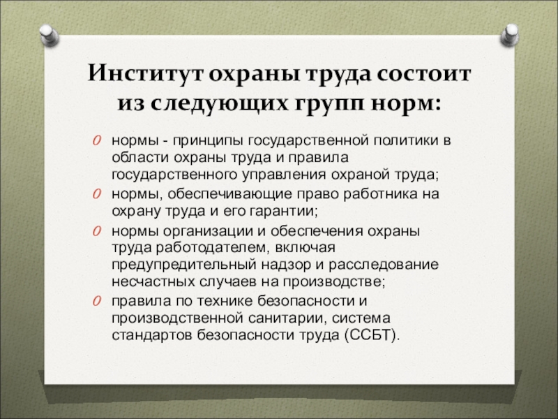 Слайд 17Институт охраны труда состоит из следующих групп норм: