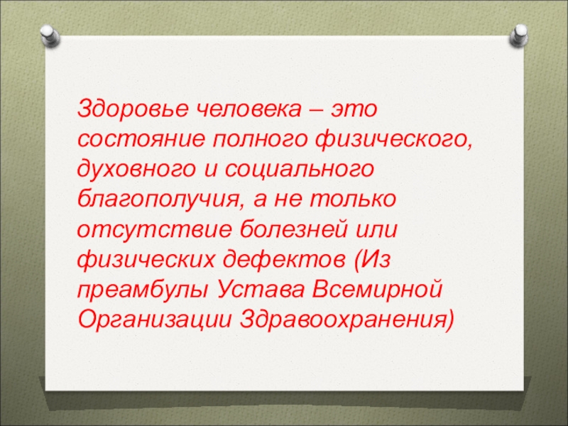 а не только отсутствие болезней или физических дефектов (Из преамбулы Устава Всемирной Организации Здравоохранения)