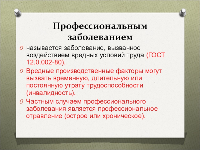 называется заболевание, вызванное воздействием вредных условий труда (ГОСТ 12.0.002-80).