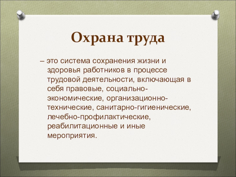 трудовой деятельности, включающая в себя правовые, социально-экономические, организационно-технические, санитарно-гигиенические, лечебно-профилактические, реабилитационные и иные мероприятия.