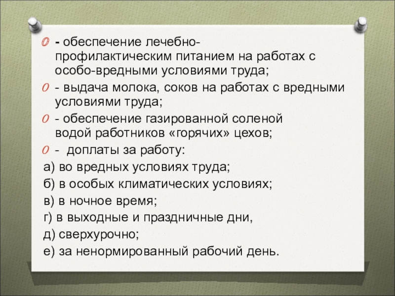6) обеспечение лечебно-профилактическим питанием на работах с особо-вредными условиями труда, выдача молока, сока на работах с вредными условиями труда;