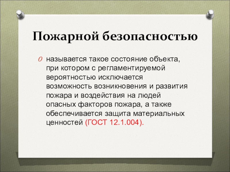 возможность возникновения и развития пожара и воздействия на людей опасных факторов пожара, а также обеспечивается защита материальных ценностей (ГОСТ 12.1.004).