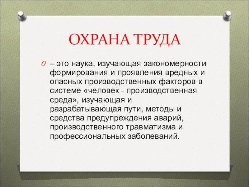 опасных производственных факторов в системе «человек - производственная среда», изучающая и разрабатывающая пути, методы и средства предупреждения аварий, производственного травматизма и профессиональных заболеваний.