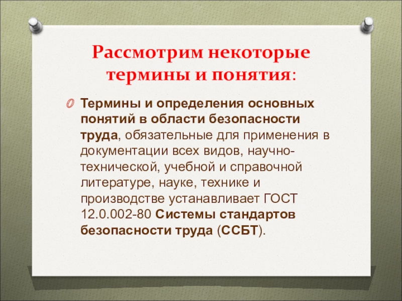 области безопасности труда, обязательные для применения в документации всех видов, научно-технической, учебной и справочной литературе, науке, технике и производстве устанавливает ГОСТ 12.0.002-80 Системы стандартов безопасности труда (ССБТ).