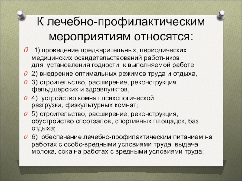 Слайд 15К лечебно-профилактическим мероприятиям относятся: