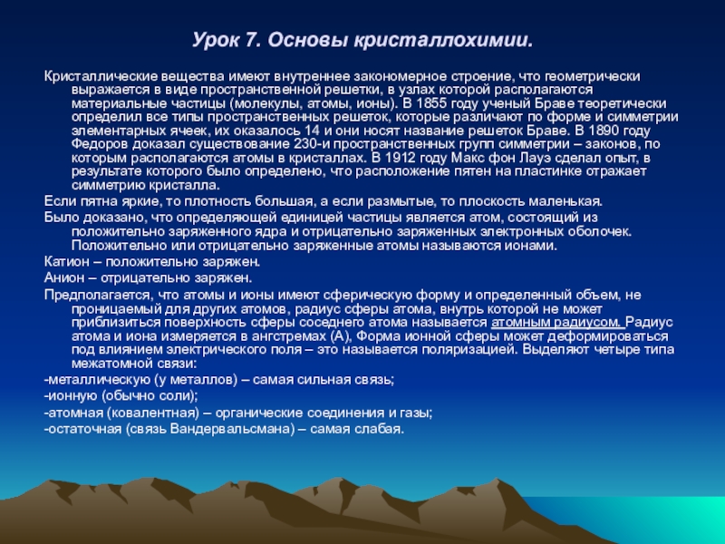 -симметрия – закономерная повторяемость в расположении предметов или их частей на плоскости или в пространстве. Эти свойства объясняются их внутренним закономерным строением. Материальные частиц, т.е. атомы, молекулы, ионы в кристаллах размещаются не хаотично, а в определенном (строгом) порядке. Эта закономерность строения кристаллов выражается в виде пространственной решетки.