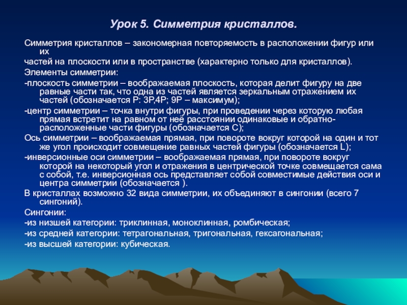 В кристаллах возможно 32 вида симметрии, их объединяют в сингонии (всего 7 сингоний).