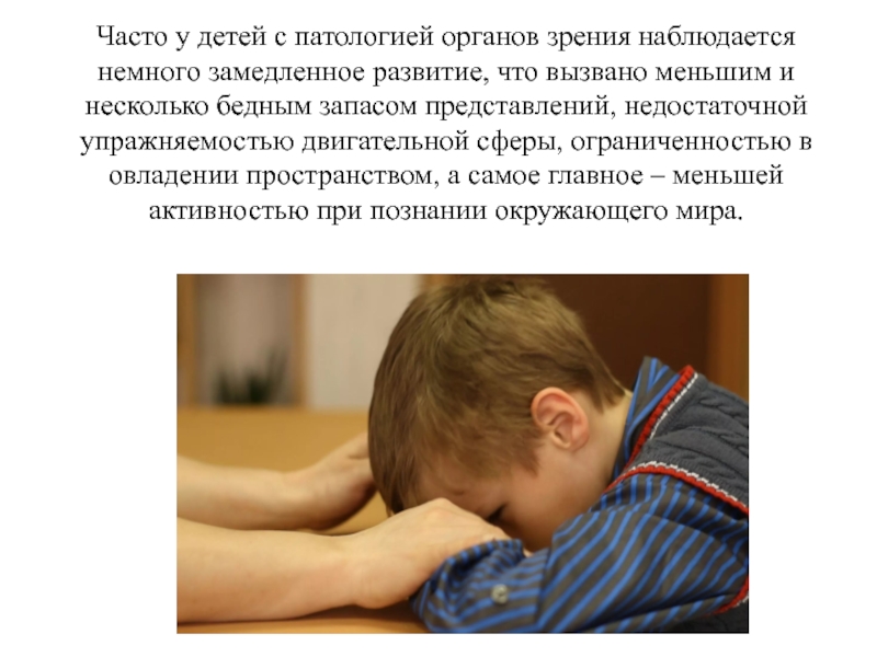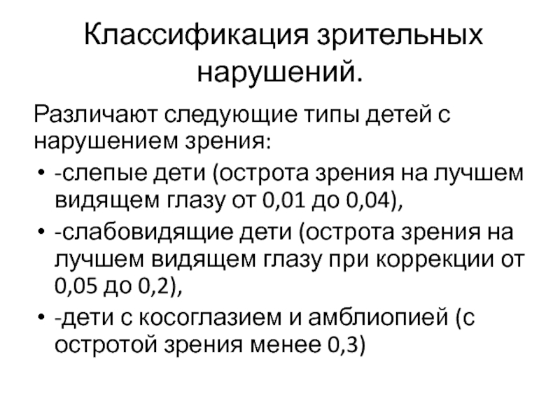 В настоящее время понятие «слепой» (незрячий) рассматривается с позиции определения ведущей системы анализаторов, на основе которой ведется педагогический процесс. Поэтому к слепым относятся две категории детей: дети со светоощущением, а также дети, имеющие остроту остаточного зрения до 0,04 включительно на лучше видящем глазу с коррекцией, обучение которых осуществляется на основе системы Брайля по учебникам, предназначенным для восприятия посредством осязания.