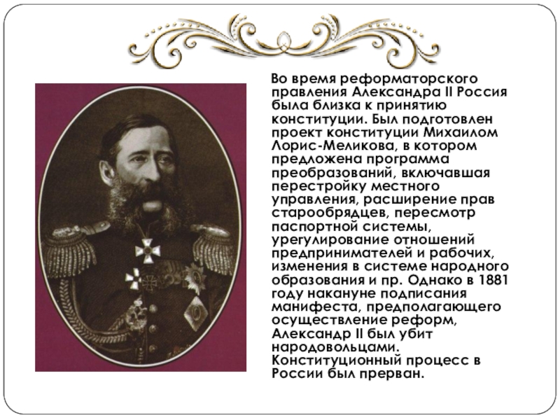 к принятию конституции. Был подготовлен проект конституции Михаилом Лорис-Меликова, в котором предложена программа преобразований, включавшая перестройку местного управления, расширение прав старообрядцев, пересмотр паспортной системы, урегулирование отношений предпринимателей и рабочих, изменения в системе народного образования и пр. Однако в 1881 году накануне подписания манифеста, предполагающего осуществление реформ, Александр II был убит народовольцами. Конституционный процесс в России был прерван.