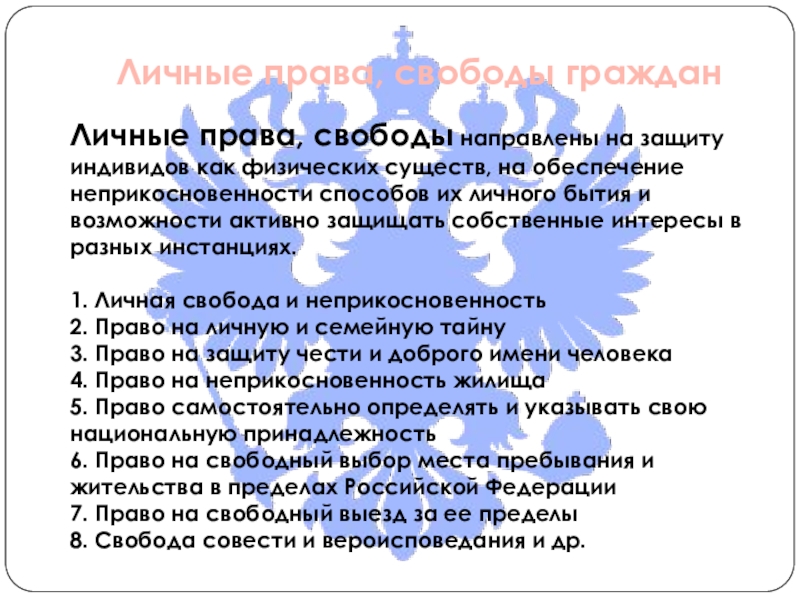устанавливаемых нормами иных отраслей права. Они имеют всеобщий характер, поскольку закрепляются за каждым человеком и гражданином, а не за узкими группами субъектов. Обеспечены повышенной защитой государства.