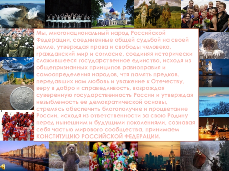 утверждая права и свободы человека, гражданский мир и согласие, соединяя исторически сложившееся государственное единство, исходя из общепризнанных принципов равноправия и самоопределения народов, чтя память предков, передавших нам любовь и уважение к Отечеству, веру в добро и справедливость, возрождая суверенную государственность России и утверждая незыблемость ее демократической основы, стремясь обеспечить благополучие и процветание России, исходя из ответственности за свою Родину перед нынешним и будущими поколениями, сознавая себя частью мирового сообщества, принимаем КОНСТИТУЦИЮ РОССИЙСКОЙ ФЕДЕРАЦИИ.