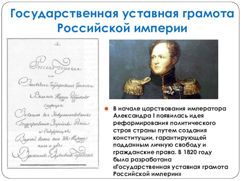 идея реформирования политического строя страны путем создания конституции, гарантирующей подданным личную свободу и гражданские права. В 1820 году была разработана «Государственная уставная грамота Российской империи»