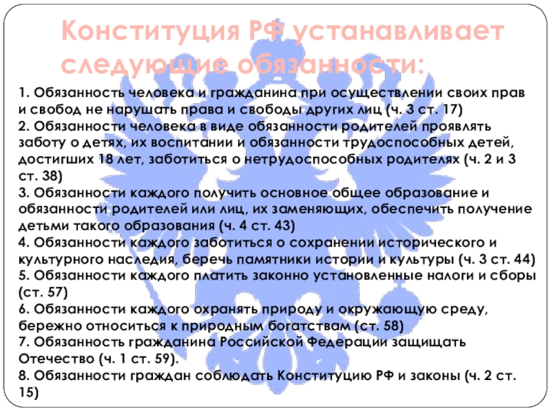 Слайд 18Конституция РФ устанавливает следующие обязанности: