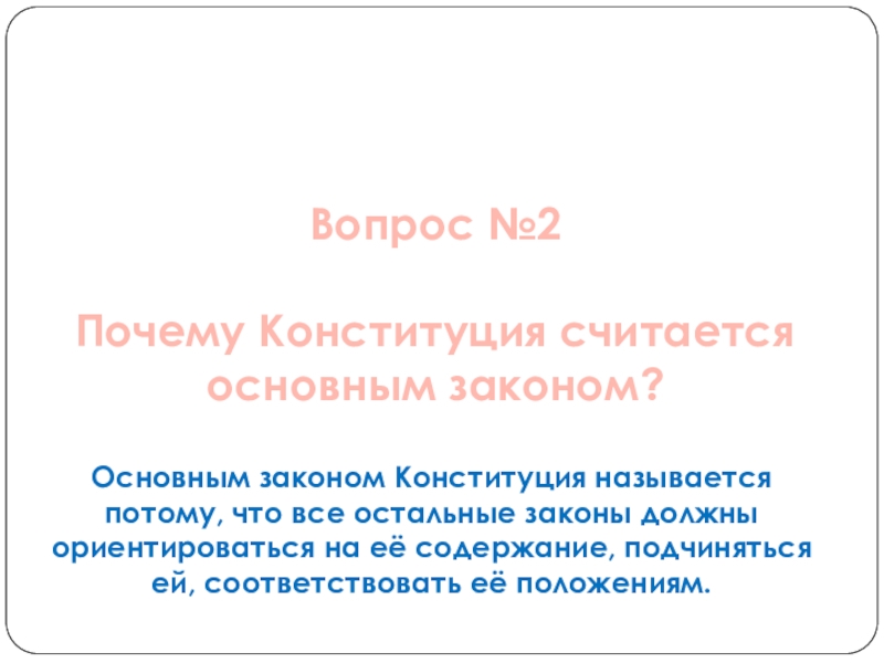 это основной закон государства, определяющий, как устроено общество, как образуются органы власти (центральные и местные), избирательная система каковы основные права и обязанности граждан, герб, гимн, флаг и столица государства Основным законом Конституция называется потому, что все остальные законы должны ориентироваться на её содержание, подчиняться ей, соответствовать её положениям.