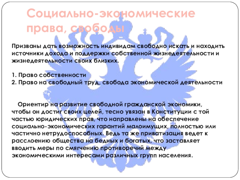 Ориентир на развитие свободной гражданской экономики, чтобы он достиг своих целей, тесно увязан в Конституции с той частью юридических прав, что направлены на обеспечение социально-экономических гарантий малоимущих, полностью или частично нетрудоспособных. Ведь та же приватизация ведет к расслоению общества на бедных и богатых, что заставляет вводить меры по смягчению противоречий между экономическими интересами различных групп населения.