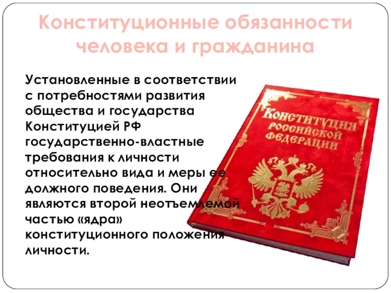 общества и государства Конституцией РФ государственно-властные требования к личности относительно вида и меры ее должного поведения. Они являются второй неотъемлемой частью «ядра» конституционного положения личности.