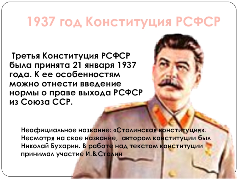 Неофициальное название: «Сталинская конституция». Несмотря на свое название, автором конституции был Николай Бухарин. В работе над текстом конституции принимал участие И.В.Сталин