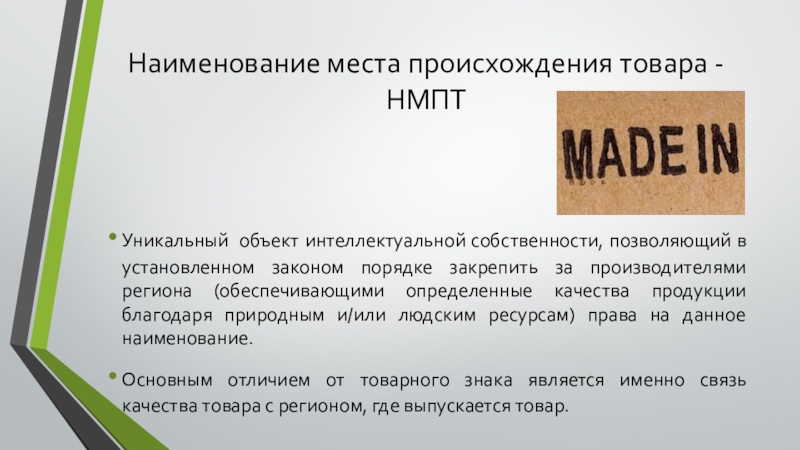 наименование места происхождения товара – название географического объекта, используемого для обозначения товара, особые свойства которого исключительно или главным образом определяются характерными и (или) людскими факторами;