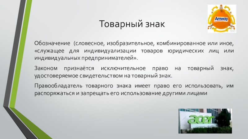 товарный знак и знак обслуживания – обозначения, позволяющие различать соответственно однородные товары и услуги разных юридических лиц или физических лиц;