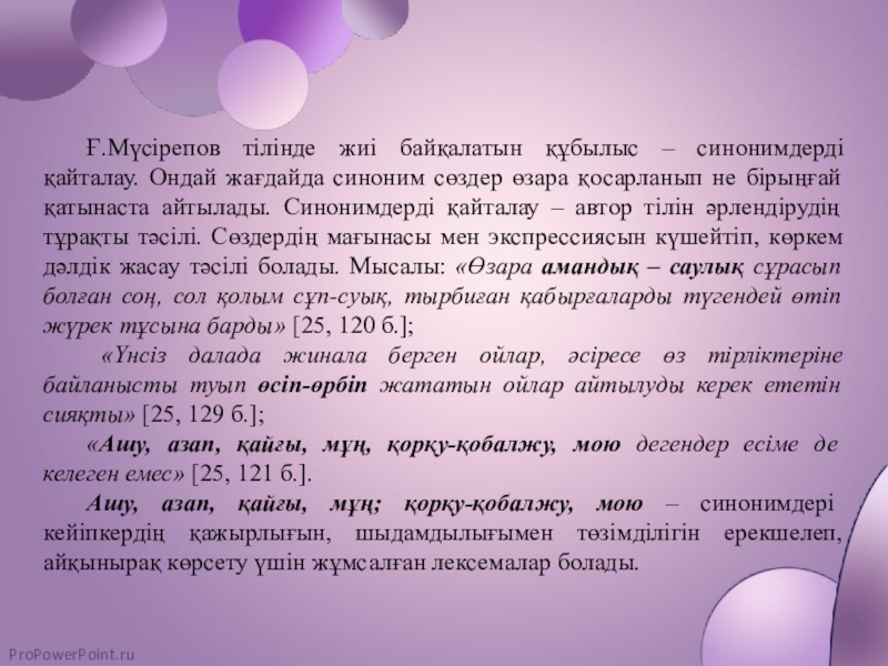 Слайд 13Ғ.Мүсірепов тілінде жиі байқалатын құбылыс – синонимдерді қайталау. Ондай жағдайда синоним