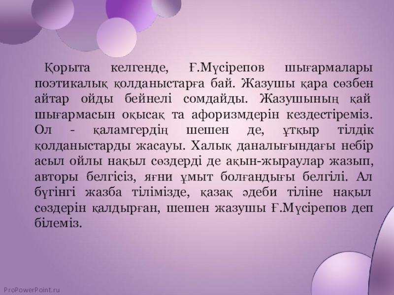 Слайд 20Қорыта келгенде, Ғ.Мүсірепов шығармалары поэтикалық қолданыстарға бай. Жазушы қара сөзбен айтар