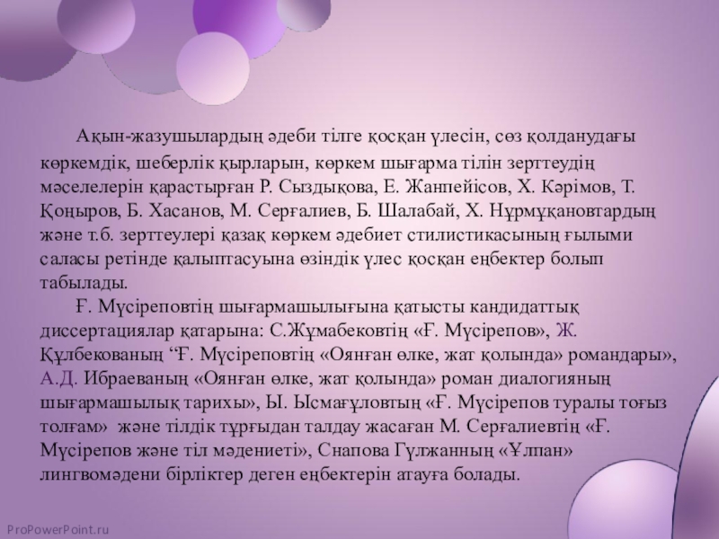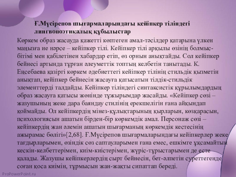Слайд 6Ғ.Мүсірепов шығармаларындағы кейіпкер тіліндегі лингвопоэтикалық құбылыстар