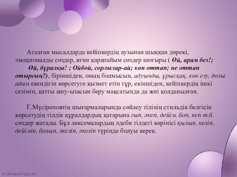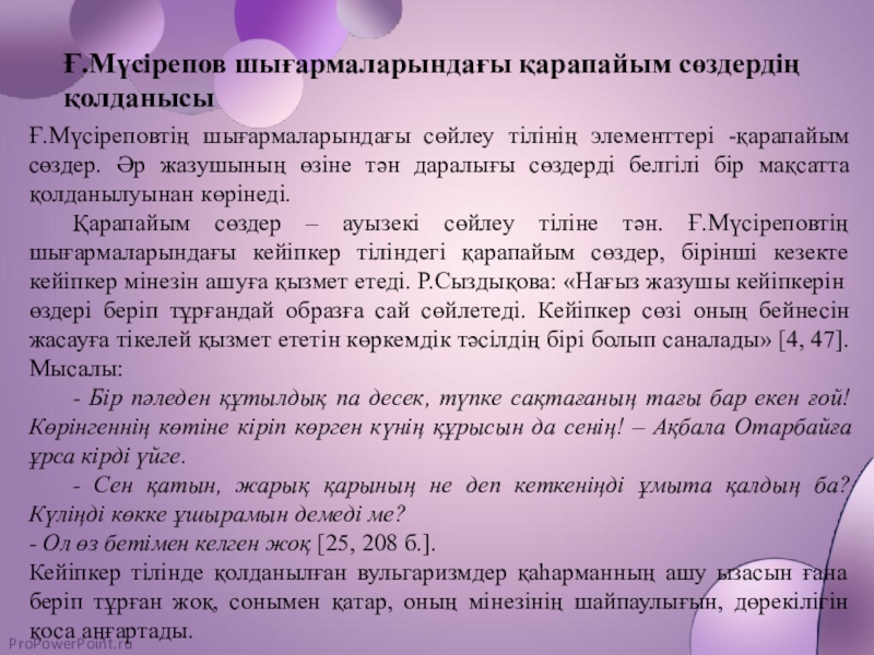Слайд 7Ғ.Мүсірепов шығармаларындағы қарапайым сөздердің қолданысы