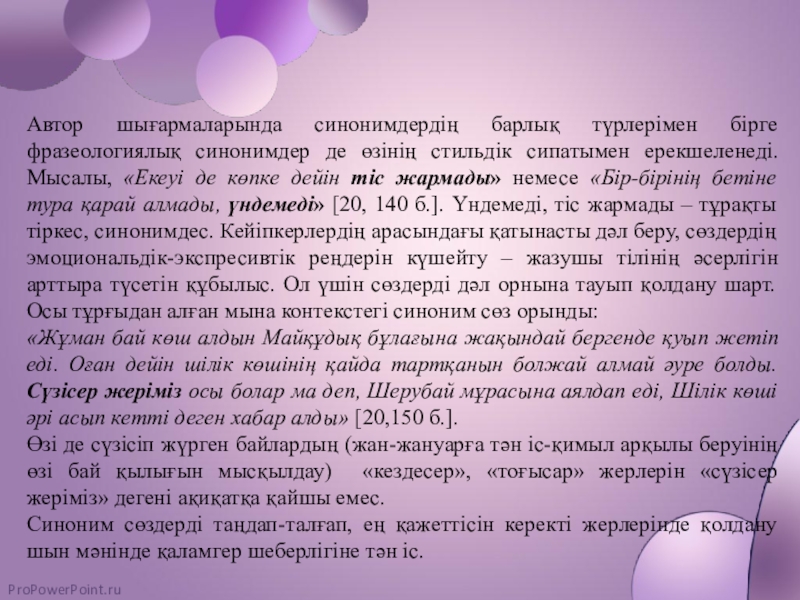 Слайд 15Автор шығармаларында синонимдердің барлық түрлерімен бірге фразеологиялық синонимдер де өзінің стильдік