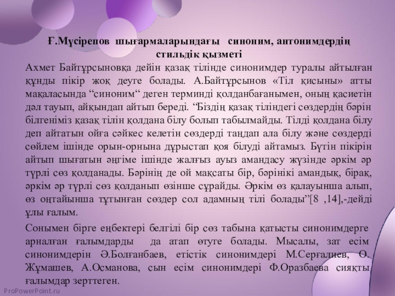 Слайд 12Ғ.Мүсірепов шығармаларындағы синоним, антонимдердің стильдік қызметі