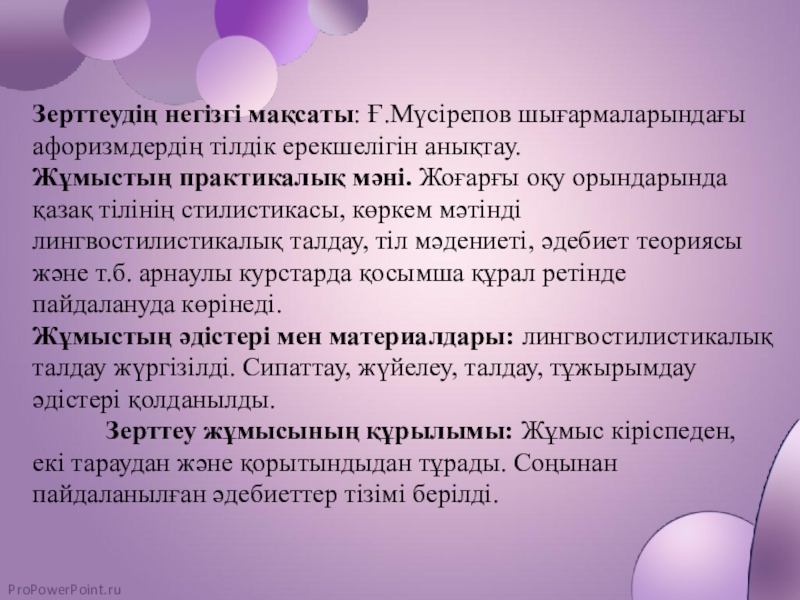 Зерттеудің негізгі мақсаты: Ғ.Мүсірепов шығармаларындағы афоризмдердің тілдік ерекшелігін анықтау.