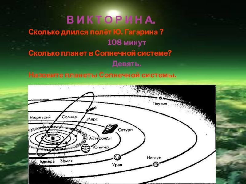 Планеты Солнечной системы: Меркурий, Венера, Земля, Марс, Юпитер, Сатурн, Уран, Нептун, Плутон.