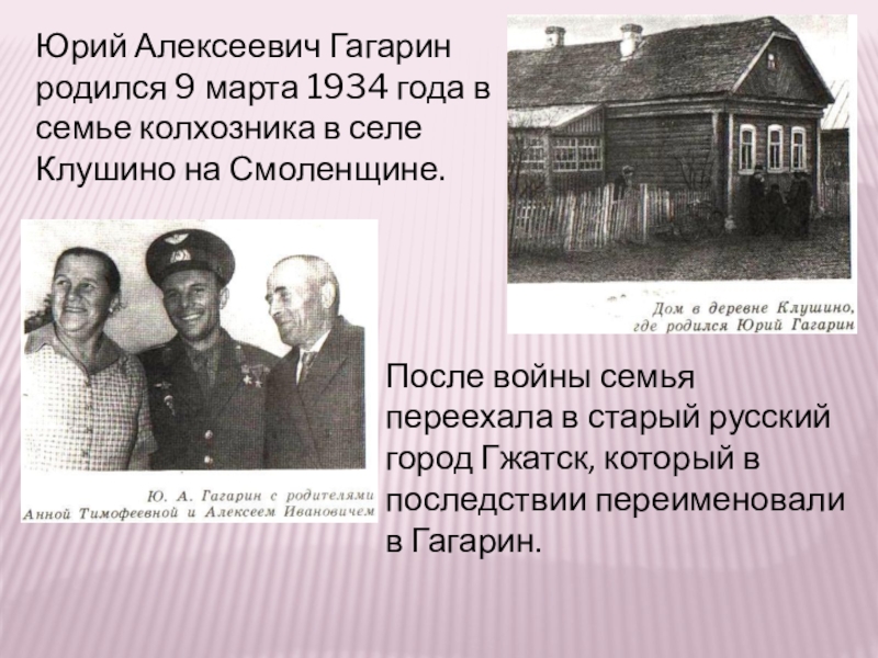 После войны семья переехала в старый русский город Гжатск, который в последствии переименовали в Гагарин.