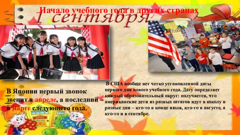 В США вообще нет четко установленной даты первого дня нового учебного года. Дату определяет каждый образовательный округ: получается, что американские дети из разных штатов идут в школу в разные дни – кто-то в конце июля, кто-то в августе, а кто-то и в сентябре.