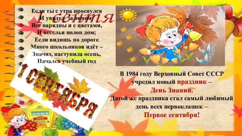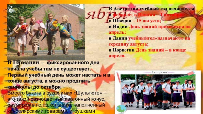 В Германии – фиксированного дня начала учебы там не существует. Первый учебный день может настать и в конце августа, а можно продлить каникулы до октября