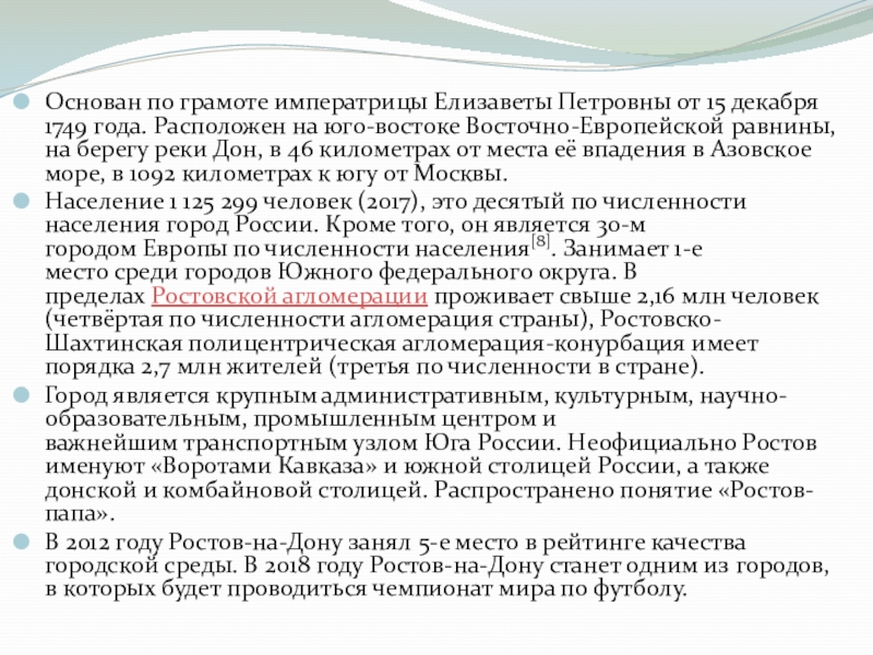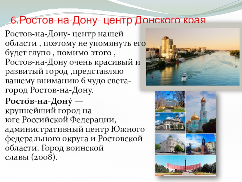 Росто́в-на-Дону́ — крупнейший город на юге Российской Федерации, административный центр Южного федерального округа и Ростовской области. Город воинской славы (2008).