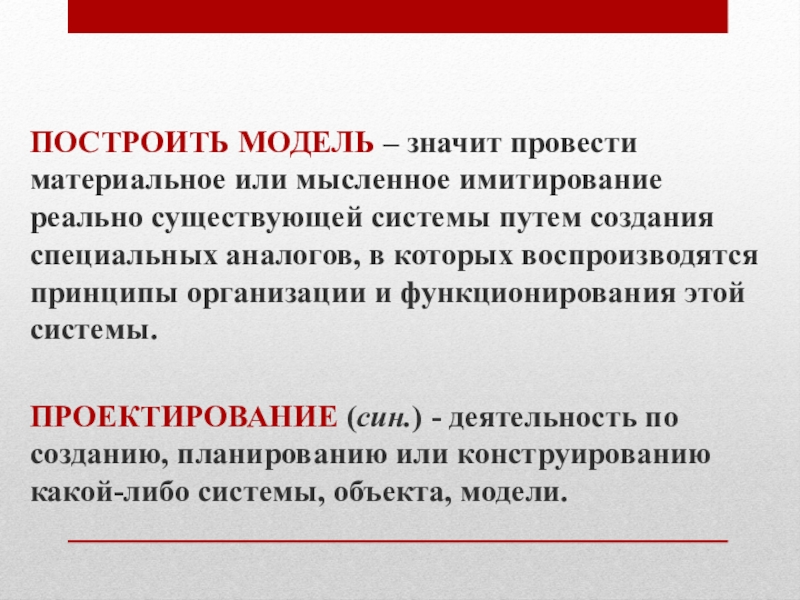 ПОСТРОИТЬ МОДЕЛЬ – значит провести материальное или мысленное имитирование реально существующей