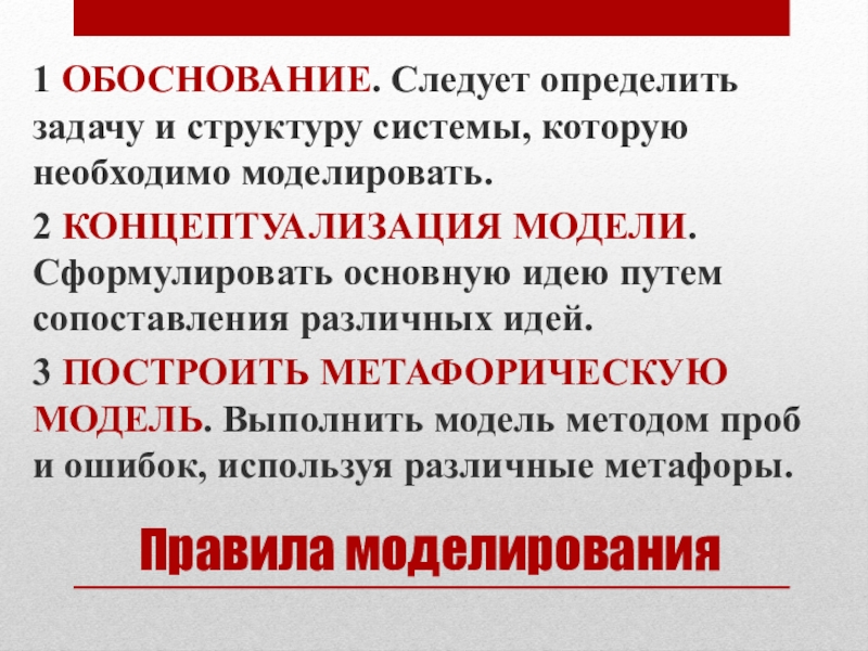 Правила моделирования1 ОБОСНОВАНИЕ. Следует определить задачу и структуру системы, которую необходимо моделировать.2 КОНЦЕПТУАЛИЗАЦИЯ МОДЕЛИ. Сформулировать основную идею