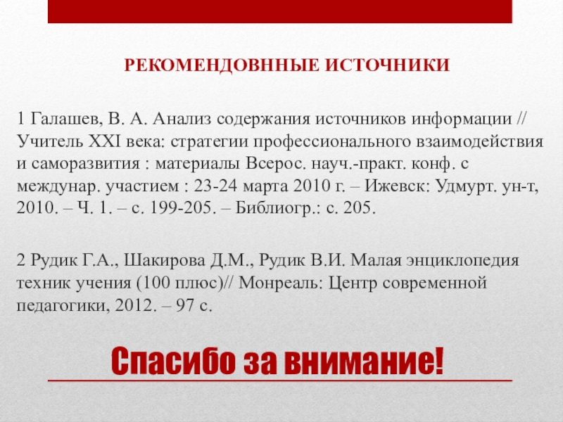 Спасибо за внимание!РЕКОМЕНДОВННЫЕ ИСТОЧНИКИ1 Галашев, В. А. Анализ содержания источников информации // Учитель XXI века: стратегии профессионального