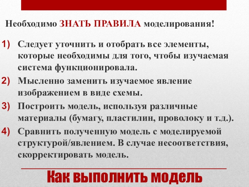 Как выполнить модельНеобходимо ЗНАТЬ ПРАВИЛА моделирования!Следует уточнить и отобрать все элементы, которые необходимы для того, чтобы изучаемая