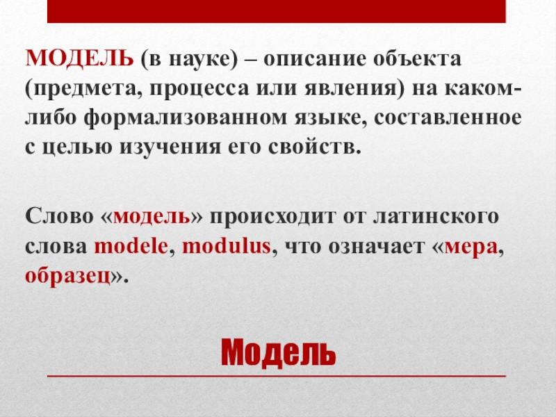 Модель МОДЕЛЬ (в науке) – описание объекта (предмета, процесса или явления) на каком-либо формализованном языке, составленное с целью изучения его свойств. Слово «модель» происходит от латинского слова modele, modulus, что означает «мера, образец».