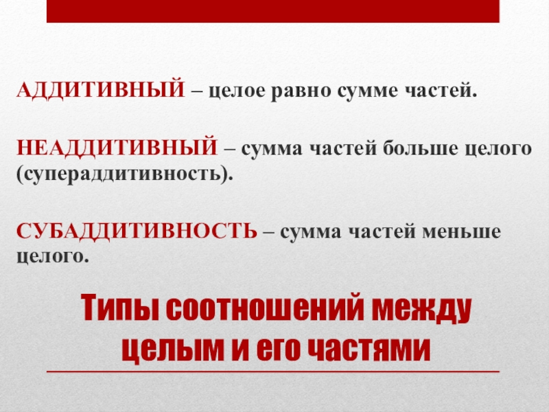 Типы соотношений между целым и его частямиАДДИТИВНЫЙ – целое равно сумме частей.НЕАДДИТИВНЫЙ – сумма частей больше целого
